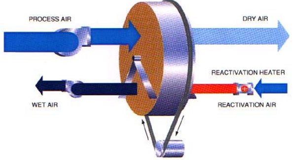 A low-humidity level is required in the air for manufacturing processes of many industries. To reduce the humidity level in the air, the air can be cooled below the dew-point temperature and reheated after eliminating the condensation moisture or a chemical absorbent can be used. A rotor is rotated between the dehumidifying unit and regenerating unit. Humid air is ventilated through the dehumidifying unit and the rotor which has absorbed moisture moves the regenerating unit to discharge the absorbed moisture. - Highly reliable at a stable humidity level - Simple structure - Suitable for low-humidity ![]() |